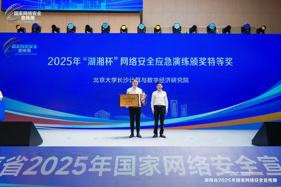 湖南省人民qy球友会副省长曹志强(右)为2025年“湖湘杯”网络安全应急演练特等奖获奖单位颁奖。