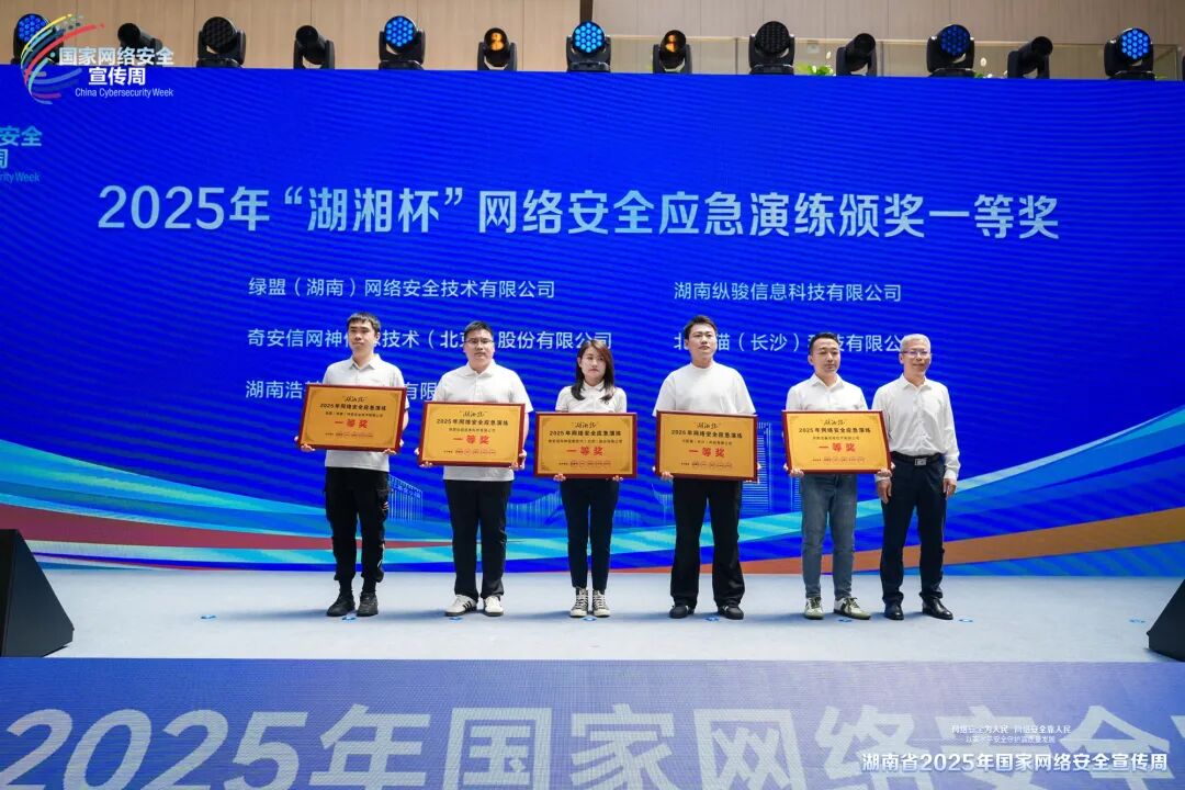 省委宣传部副部长(兼)、省委网信办主任刘学(右一)为2025年“湖湘杯”网络安全应急演练一等奖获奖单位颁奖。