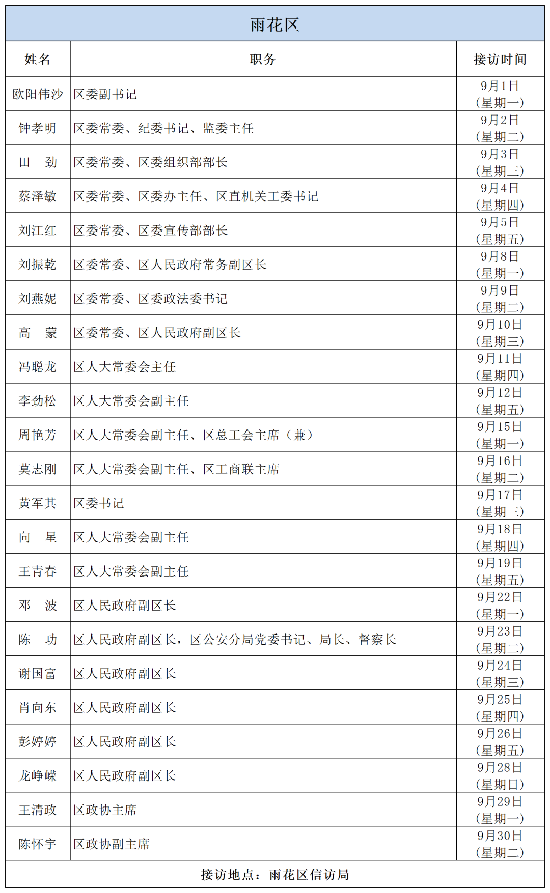 为密切联系群众,畅通信访渠道,依法及时就地解决群众合理合法诉求,现将2025年9月份雨花区领导接访安排予以公告,群众可根据公告的接访安排到指定地点反映诉求。
