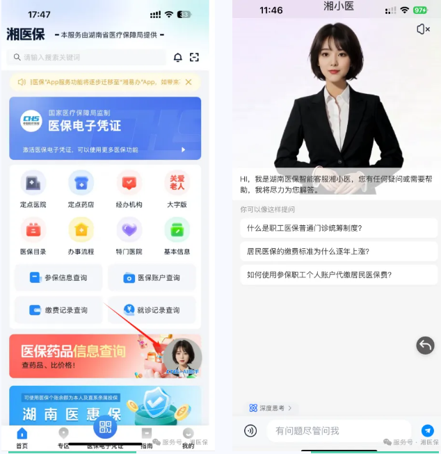 “湘小医”“湘小保”医保AI智能服务体,融合了自然语言处理、大数据、人工智能等先进技术,基于DeepSeek大模型构建,具备强大的逻辑能力,能够深度理解医保政策和用户问题,提供精准详细且个性化的解答。同时,具备强大的学习能力,可不断适应医保政策变化,优化服务内容,将有效减轻人工负担,为用户带来更加便捷、高效、智能的医保咨询体验。参保人可通过“湘医保”公众号、微信小程序、支付宝小程序登录湘医保服务平台体验“湘小医”相关服务。“湘小保”供全省医保系统工作人员在省医保信息平台使用,将主要提供智能查询、智能报表、辅助审核等服务。