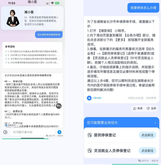 更值得一提的是,“湘小医”还具备AI导办(即问即办)功能。当参保人咨询医保业务办理相关问题时,它不仅能够详细告知办理流程、所需材料,还能在具备条件的情况下,实现即问即办。比如,参保人想要办理异地就医备案,只需向“湘小医”提出问题,它便可以引导参保人完成线上备案操作,让医保经办服务更加高效、贴心。