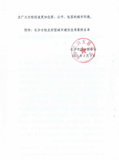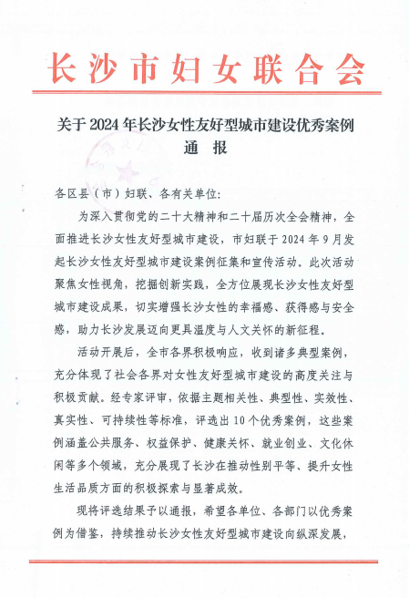 关于2024年长沙女性友好型城市建设优秀案例通报